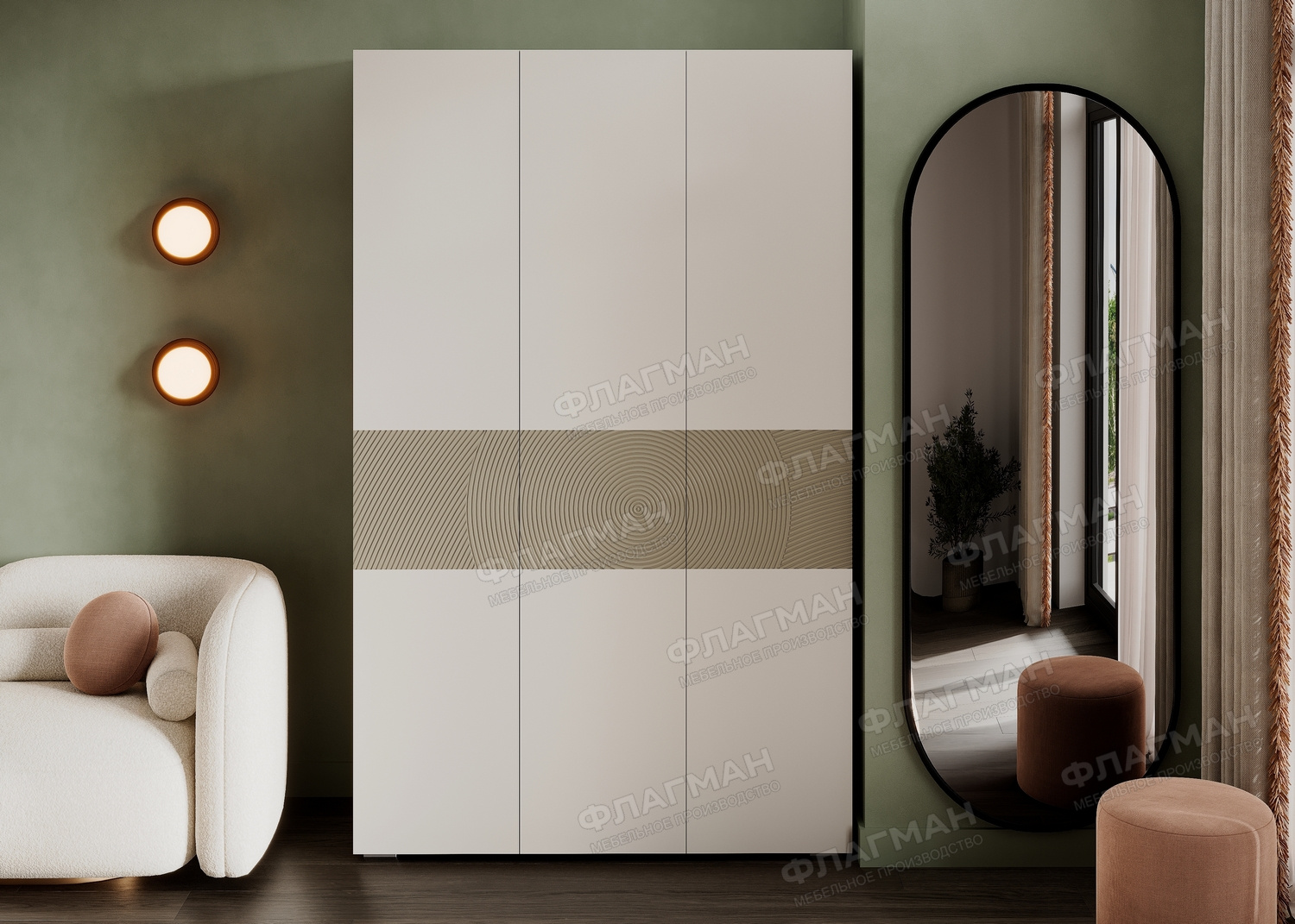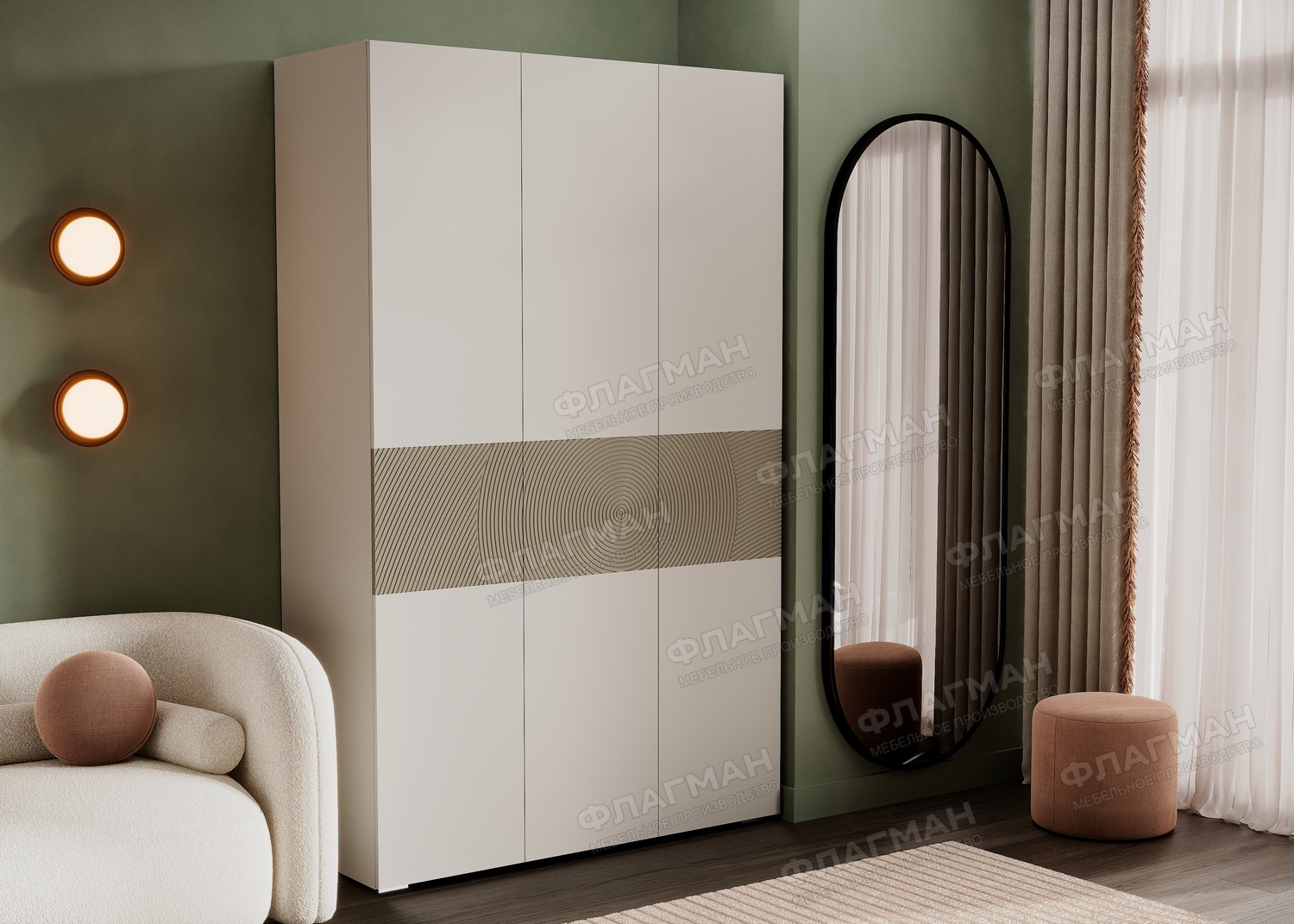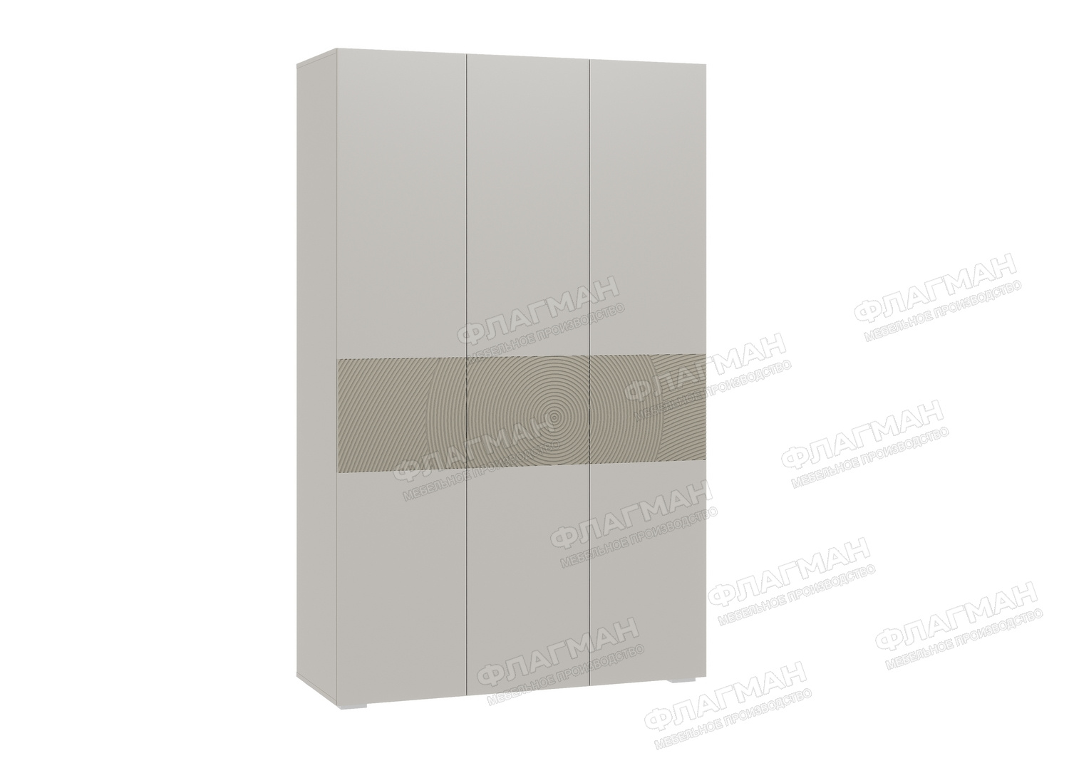 - Верхняя и нижняя часть створок изготавливается из ЛДСП в цвет корпуса шкафа. В центральной части створок используется материал МДФ в пленке ПВХ с фрезеровкой. Отличительной особенностью фрезеровки фасадов является радиусный рисунок.